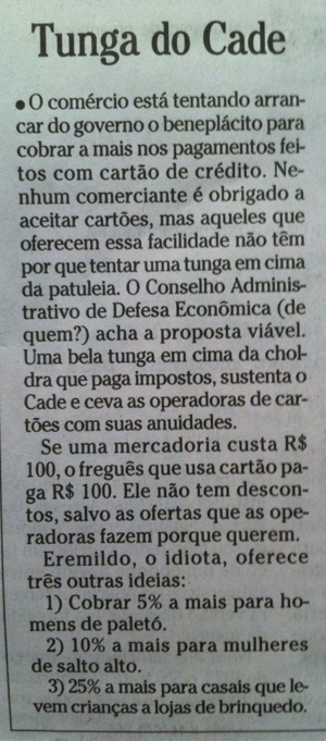 – câmeras de segurança. Hoje em dia tem câmera por toda parte. Sorte dos cidadãos brasileiros. São elas que resolvem crimes no geral, de homicídios a pequenos furtos. Seu papel mais importante acontece quando são escondidas para filmar negociações de falcatruas. Os próprios membros das quadrilhas costumam gravar reuniões para garantir o futuro. Quando algo dá errado e algum demóstenes quer se fazer de bonzinho, surge uma bela gravação para entregar o meliante. É chantagem mesmo. Mas os brasileiros saem ganhando. O prefeito de Palmas, do PT, sintetizou a visão que os políticos têm das temidas câmeras declarando: “Tive o azar de ser filmado numa reunião com o bicheiro Cachoeira.” Azar o dele! Sorte nossa! Continue lendo “os pilares de nossa democracia”