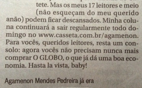 A coluna erigida na última página do Caderno B do JB, digo, Segundo Caderno de O Globo, acabou. Pô. Eu utilizava o jornal de domingo (sempre há outras funções para o papel de um jornal) para ler os excelentes, criativos, referenciados e, apesar disso, muito bons trocadilhos do Casseta. Agora vou ter que desenvolver mais uma atividade virtual na minha vida: acessar o site www.casseta.com.br. Que saco.